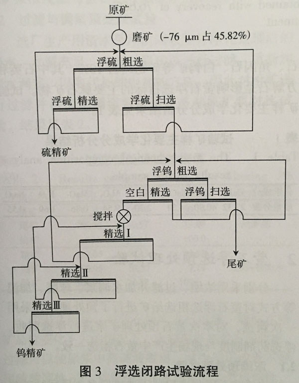 表 5试验结果表明,单一浮选法回收矿石中的白钨矿是可行的。优先脱硫后经一次粗选、一次扫选,钨粗精矿加大量水玻璃强烈搅拌后三次精选,可获得钨精矿产率为1.09%、W03品位为71.78%、回收率为90.19%的良好指标。